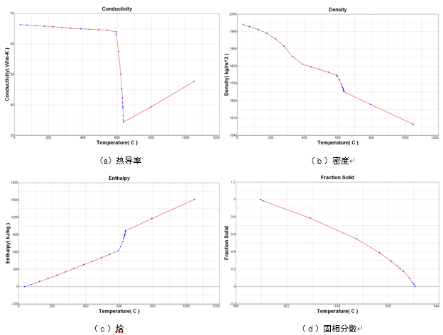 圖5:物性參數 4.2 澆注參數 數值模擬初設工藝參數見表2。鑄件與砂型之間的傳熱系數取500 W?m-2?K-1,鑄件與冷鐵之間的傳熱系數取1000 W?m-2?K-1,冷鐵與鑄型之間的傳熱系數取750 W?m-2?K-1,鑄型表面空冷。