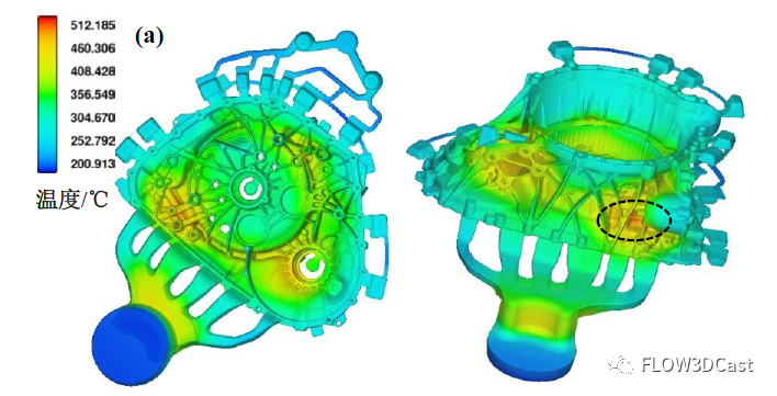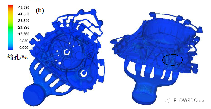 (b)卷氣 圖6:離合器殼體充型完畢時(0.56s)的溫度場及卷氣情況 圖7為金屬液凝固模擬結(jié)果,圖示為完全凝固后零件的溫度和縮孔缺陷分布情況。可以看出,所得零件絕大部分區(qū)域溫度差異較小,僅在左側(cè)復(fù)雜結(jié)構(gòu)處存在小范圍的過熱區(qū)域,且在此處存在少量縮孔,如圖中圈出區(qū)域。結(jié)合圖6中金屬液的溫度及卷氣特征, 充型結(jié)束時缺陷處并未有明顯的氣體殘留,因而此處的缺陷主要源于其復(fù)雜結(jié)構(gòu)及厚大尺寸,凝固時存在一定程度的收縮,導(dǎo)致最終完全凝固時少量縮孔的形成[12-13]。為了消除該缺陷,通過在此處增設(shè)冷卻水道, 降低該處模具溫度,使此處合金液優(yōu)先冷卻凝固,從而消除收縮缺陷。