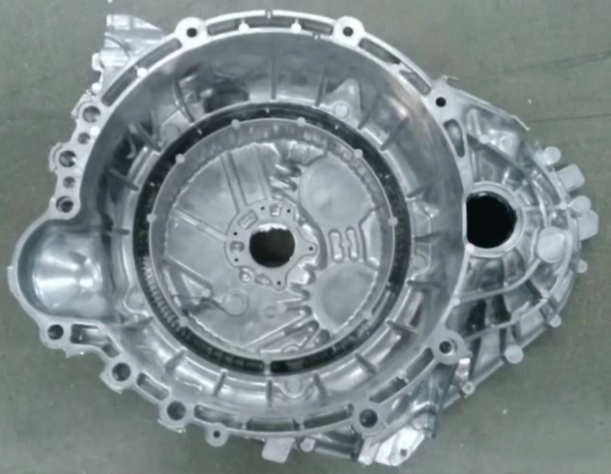 (b)縮孔預(yù)測 圖7:離合器殼體凝固完畢時(38.31s)的溫度場與縮孔缺陷 綜上模擬結(jié)果,表明采用多向高速實(shí)時控制抽真空系統(tǒng)用于壓鑄機(jī)輔助抽真空,幾乎能完全消除氣孔缺陷,實(shí)現(xiàn)離合器殼體的高致密化壓鑄。通過數(shù)值模擬分析了離合器殼體的卷氣發(fā)生部位,預(yù)測了壓鑄缺陷的種類及位置,在此基礎(chǔ)上優(yōu)化了抽真空系統(tǒng)的設(shè)計,并結(jié)合高真空工藝多次試制的試驗(yàn)結(jié)果,得出了高真空壓鑄工藝使用的最優(yōu)參數(shù)。 圖8為在優(yōu)化的工藝條件下高真空壓鑄試制的離合器殼體零件,外形完整。圖9為該零件的X射線檢驗(yàn)照片。由圖可知,X射線檢測并未發(fā)現(xiàn)明顯的縮孔,而且零件外部完整,未發(fā)現(xiàn)澆不足等缺陷。相比于普通壓鑄生產(chǎn)的離合器殼體,真空壓鑄幾乎完全消除了零件內(nèi)部的氣孔缺陷,產(chǎn)品的內(nèi)部質(zhì)量明顯提高。此外,機(jī)加工后產(chǎn)品滲漏等測試結(jié)果顯示,產(chǎn)品合格率達(dá)到97.5 %,而普通壓鑄的產(chǎn)品合格率僅為91.8%,合格率提高了6.2%。該試驗(yàn)結(jié)果與上述模擬結(jié)果較好地吻合,表明多向高速實(shí)時控制抽真空系統(tǒng)用于壓鑄機(jī)輔助抽真空,幾乎完全消除了氣孔缺陷,實(shí)現(xiàn)離合器殼體的高致密化壓鑄,大大地提高產(chǎn)品的質(zhì)量。