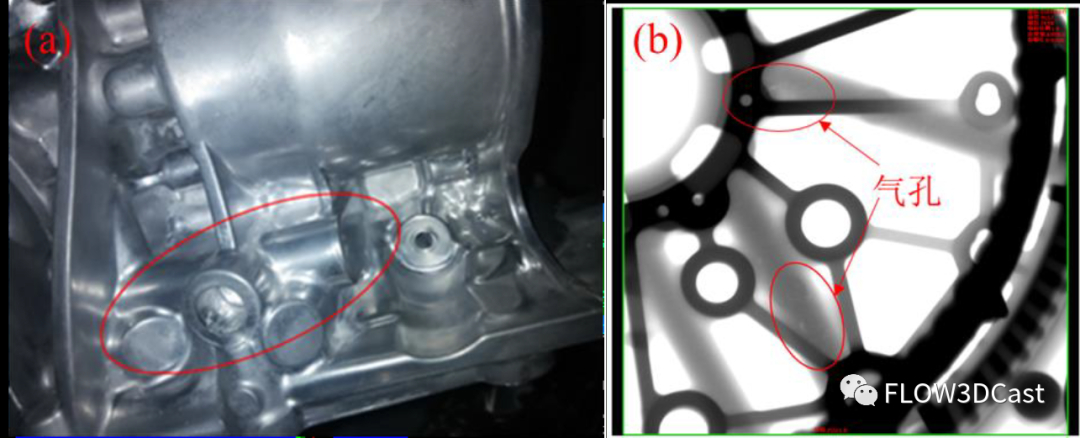 圖1:離合器殼體三維圖 2、離合器殼體高真空壓鑄工藝 圖2a為非真空普通壓鑄生產(chǎn)離合器殼體的局部區(qū)域。圖2b為零件局部的X射線檢測結(jié)果。在軸承孔周邊多股金屬液交匯處會產(chǎn)生大量氣孔,如圖2a橢圓區(qū)域,內(nèi)部質(zhì)量達(dá)不到X光檢測質(zhì)量要求而報廢。從離合器殼體內(nèi)部氣孔的X射線(圖2b)可以更清楚地看出,鑄件內(nèi)部氣孔較多,產(chǎn)品品質(zhì)較差。因此,為了消除氣孔缺陷、提高產(chǎn)品質(zhì)量,采用新型的多向高速實(shí)時控制抽真空系統(tǒng)用于高真空壓鑄,實(shí)現(xiàn)高致密化壓鑄。