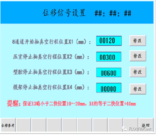 (a)零件局部 (b)X射線照片 圖2:普通壓鑄生產(chǎn)的離合器殼體壓鑄件 圖3為帶抽氣通道、澆注系統(tǒng)和溢流槽等的離合器殼體壓鑄工藝。離合器殼體的高真空壓鑄模具通過壓射位置控制高真空系統(tǒng)的開關(guān)。抽真空工作過程:壓鑄時,當(dāng)壓射沖頭到達(dá)真空啟動的位置時,真空泵啟動,壓射沖頭繼續(xù)前進(jìn);當(dāng)沖頭到達(dá)關(guān)閉真空泵的位置后,真空泵抽氣結(jié)束。因此,對于多向抽真空壓鑄系統(tǒng),需要確定泵啟動真空極限值、泵停止真空極限值以及抽真空行程(沖頭位置)設(shè)置。泵啟動真空極限值和泵停止真空極限值設(shè)置得越大,真空泵維持的真空度越高,每當(dāng)多次抽氣后低于泵啟動真空極限值時,泵才重新啟動繼續(xù)抽真空。抽真空行程設(shè)置是抽真空系統(tǒng)最為關(guān)鍵的參數(shù),主要根據(jù)鋁液的澆注量、壓室的尺寸來確定。根據(jù)試生產(chǎn)的情況,確定系統(tǒng)的X1-X4參數(shù)值如圖4所示。