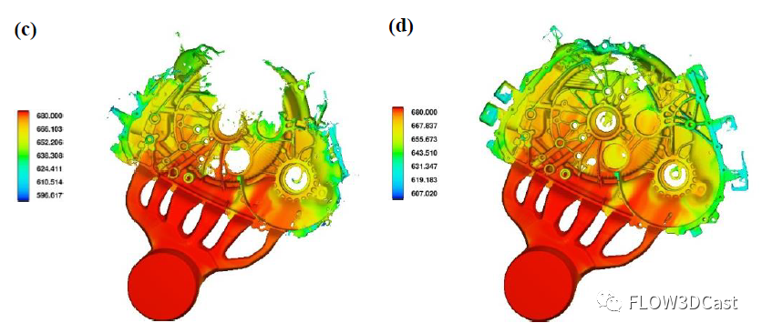 圖4:離合器殼體試生產(chǎn)所用抽真空行程參數(shù) 3、離合器殼體高真空壓鑄過程模擬及工藝優(yōu)化 為了縮短開發(fā)周期,得出高真空工藝使用的最優(yōu)技術(shù)參數(shù),根據(jù)現(xiàn)有的澆注系統(tǒng)和抽真空系統(tǒng),借助FLOW-3D模擬分析軟件對鑄件的充型及凝固過程進(jìn)行分析,以了解鑄件卷氣情況及在冷卻凝固過程氣孔缺陷產(chǎn)生的位置及大小。FLOW-3D特有的FAVOR(部分面積/體積表示法)方法可以定義光滑的曲面,精確表示復(fù)雜的幾何形狀,避免出現(xiàn)臺階狀的表面,以改善流動和熱傳導(dǎo)分析精度。此外,該軟件使用TruVOF方法, 精確模擬自由表面的位置、運(yùn)動及對流體的影響,適合計算高速流動狀態(tài)。在鑄件充型過程的模擬中,將液態(tài)金屬看作不可壓縮流體,液態(tài)金屬充型的模擬, 實(shí)際就是求解一組非穩(wěn)態(tài)的流體流動控制方程組。求解后就可獲得壓鑄過程的流動場及溫度場。可以分析壓鑄過程中的卷氣、縮孔縮松、澆不足等缺陷。 根據(jù)實(shí)際的壓鑄工藝參數(shù)設(shè)定模擬參數(shù),模擬過程中型腔的真空度設(shè)定為90kPa,材料為ADC12壓鑄鋁合金。根據(jù)零件的結(jié)構(gòu)特征,所設(shè)計的壓射工藝參數(shù)為:慢速壓射速度0.2m/s,快速壓射速度4.5m/s,高速切換點(diǎn)0.51s。 圖5為離合器殼體充型過程模擬中金屬液的溫度變化和卷氣情況。由圖5a-d可知,金屬液通過設(shè)計好的澆注系統(tǒng)能平穩(wěn)地充填型腔,零件自下而上依次充型。同時,根據(jù)模擬結(jié)果還可以看出,經(jīng)多向高速實(shí)時控制抽真空系統(tǒng)輔助壓鑄機(jī)抽真空后,在充型過程中卷氣含量明顯降低,最大值僅有0.635%,如圖5e-h所示。此外,在最后充型階段,存在一些溫度較低、卷氣量較大的金屬液,但均進(jìn)入設(shè)計好的溢流槽中,零件脫模后可以去除。 圖6為離合器殼體充型完畢時的溫度場及卷氣情況。可知,充型結(jié)束時,零件內(nèi)部溫度較為均勻,且卷入零件內(nèi)部的氣體含量較少。該模擬結(jié)果表明真空壓鑄能完全消除氣孔缺陷,實(shí)現(xiàn)高致密化壓鑄。