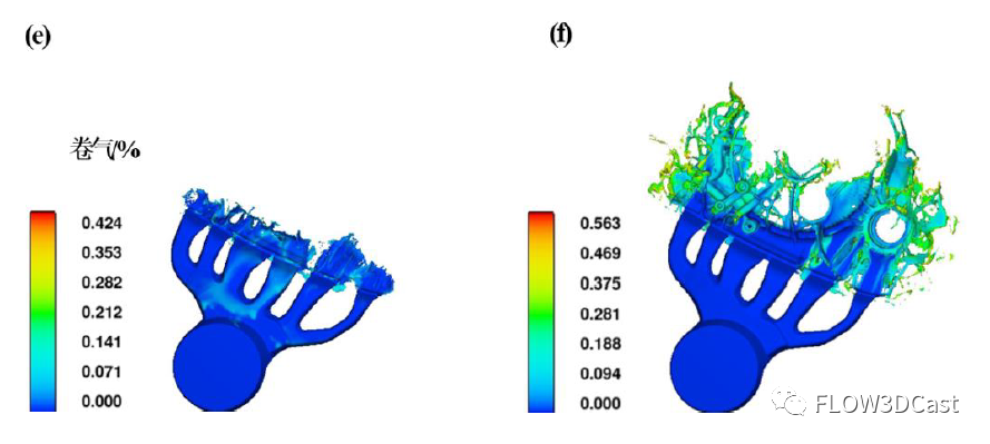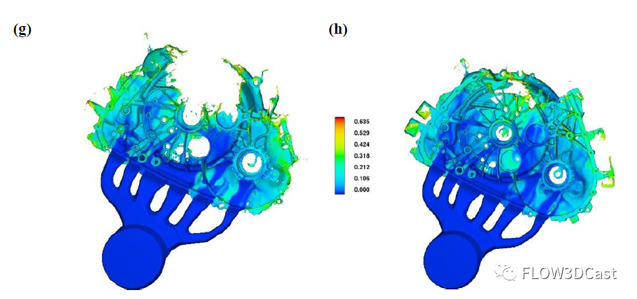 (g)卷氣,0.54 s (h)卷氣,0.55 s 圖5:離合器殼體真空壓鑄充型過程中的溫度場和卷氣情況