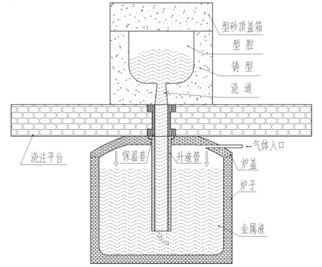 圖1:基座鑄件示意圖 鑄件輪廓尺寸為918 mm×750 mm×305.6 mm,結構復雜且鑄件多個形狀只能通過下芯鑄出;壁厚差異較大,最薄壁厚為16 mm、最厚壁厚達到了42 mm,鑄件熱節分散且相互干涉,因此難以實現順序凝固,給鑄造工藝設計帶來很大的困難。 1.2 基座鑄造工藝方案設計及參數選擇 基座鑄件結構較復雜,鑄件熱節多且分散,采用重力澆注很難保證鑄件熱節處不產生縮孔或疏松。采用低壓鑄造澆注ZL205A合金基座,其基本原理見圖2。其原理是在裝有金屬液的坩堝中,通入干燥的惰性氣體,使金屬液沿著升液管自下而上通過澆道進入型腔,待金屬液充滿型后,增大氣壓,使液面上的氣體壓力保持至鑄件完全凝固,然后解除壓力,開型后獲得所需的鑄件。