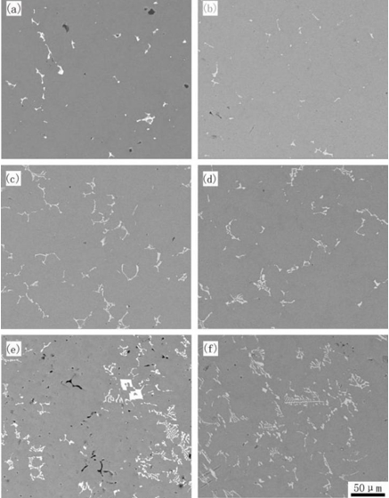 圖1:在不同Fe 含量和擠壓壓力下合金的背散射SEM微觀組織