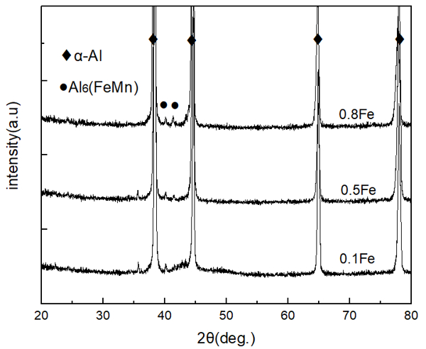 圖2:合金微觀組織中Al6(FeMn)相的定量分析:(a)漢字狀Al6(FeMn)相的體積分數;(b)板條狀Al6(FeMn)相的體積分數;(c)漢字Al6(FeMn)相的尺寸;(d)板條狀Al6(FeMn)相的尺寸 圖3:為當擠壓壓力為0 MPa 時不同Fe 含量合金XRD 譜圖。可以看出合金中相的組成為α(Al)+ Al6(FeMn),隨著Fe含量增加,Al6(FeMn)相的衍射峰也逐漸增加。XRD結果進一步證明,合金中存在的富鐵相為Al6(FeMn),與能譜分析結果一致。