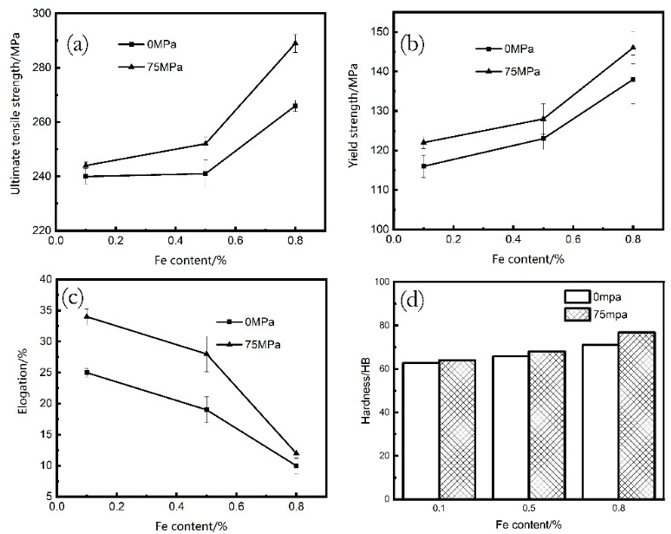 圖4:不同Fe含量合金和不同壓力下合金的力學性能