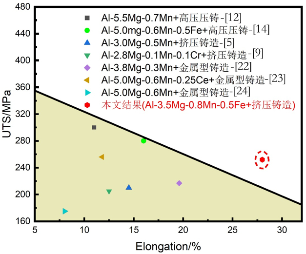 ![]() 原標題:Fe含量對擠壓鑄造Al-3.5Mg-0.8Mn合金組織與性能的影響 摘要:采用拉伸和硬度測試、掃描電鏡和X 射線衍射儀等手段,研究了不同Fe含量對擠壓鑄造Al-3.5Mg-0.8Mn合金顯微組織和力學性能的影響。結果表明,Fe能改善合金的力學性能,合金中只存在Al6(FeMn)相。合金的抗拉強度和屈服強度隨著Fe含量的增加而增大,伸長率隨著Fe含量的增加而降低,原因是隨著Fe含量增加,硬脆的Al6(FeMn)相的增多。在擠壓壓力為75 MPa和Fe含量為0.5 %時,合金綜合力學性能最佳,其抗拉強度為252 MPa,屈服強度為128 MPa,伸長率為28 %。 隨著節能減排和綠色鑄造趨勢的加強,交通領域安全結構件的輕量化日益得到重視,尤其是新能源汽車領域,對高強、高韌、輕質鋁合金安全結構件的需求愈加強烈。Al-Mg系鋁合金具有密度小、比強度高、成形性好、耐腐蝕、可焊性好等特點,是交通領域安全結構件上得到關注。然而,Al-Mg系鋁合金因其較差的熔鑄性能和較低的強度,限制了其作為交通領域安全結構件的使用。 Al-Mg-(Mn)合金是非熱處理型鋁合金,因此減少了熱處理的成本和零件的變形。為了改善和提高鋁鎂合金的熔鑄性能和力學性能,目前主要有兩種途徑:一是改變成形工藝,比如采用壓力鑄造來生產鋁鎂合金精密零部件。但由于氣體卷入,導致性能較差。擠壓鑄造具有工藝簡單、成本低、產品性能好、質量可靠等特點,能實現近凈成形,生產高質量鑄件取代鍛件。廣泛應用于Al-Si、Al-Cu和Al-Zn合金的成形。目前為止,針對擠壓鑄造Al-Mg-(Mn)合金的研究報道還較少。另外,合金化也是提升Al-Mg合金性能的主要途徑之一,主要通過添加Sc、Zr、Cu等元素來實現,大幅提升了合金的成本。Ji等研究Fe含量對壓鑄Al-Mg-Mn合金組織和性能的影響,發現在保留較高伸長率的基礎,Fe含量可以顯著提升合金的強度。此外,Fe作為鋁合金中常見的雜質元素,一般無法避免,在廢鋁回收過程中還會不斷累積。前期研究結果發現,在擠壓鑄造高鐵含量鋁銅合金中,擠壓鑄造可以改善雜質Fe對鋁銅合金的危害,有利于廢鋁的回收再利用。 基于此,本課題采用擠壓鑄造技術開發了高鐵含量Al-Mg-Mn合金,主要研究Fe含量對擠壓鑄造非熱處理型Al-3.5Mg-0.8Mn合金顯微組織和力學性能的影響,為高性能、低成本、易再生的高鐵含量非熱處理型擠壓鑄造Al-Mg-Mn合金提供參考,以滿足交通領域高強、高韌、輕質鋁合金安全結構件的需求。 1、試驗材料和方法 試驗所用原料(質量分數)為:純度為99.8%的鋁錠、純度為99.97%的純鎂、Al-10Mn、Al-14Mn、Al-5Ti-B中間合金。在井式電阻爐中進行合金熔煉,熔體經過精煉、除氣、扒渣后,于720 ℃左右進行澆注,制備Al-3.5Mg-0.8Mn-XFe合金,其化學成分見表1。