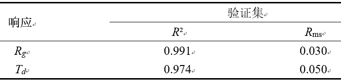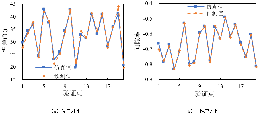 圖6:模型精度驗證 檢驗預測的精度一般通過擬合優度(R²)來判斷搭建的模型的精度,R²的取值范圍為0~1,R²的值越接近1,說明預測模型的預測效果越好。表2為驗證集關于間隙率和溫差的擬合優度值和均方誤差,R²的值均高于0.97,均方誤差(Rms)也在0.04左右。說明Kriging元模型能夠精確地預測到未知的響應,也建立了近似的輸入輸出關系。