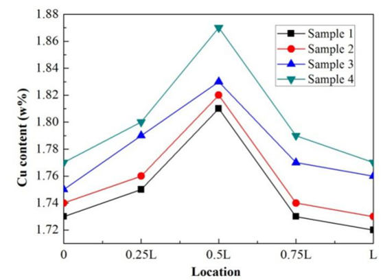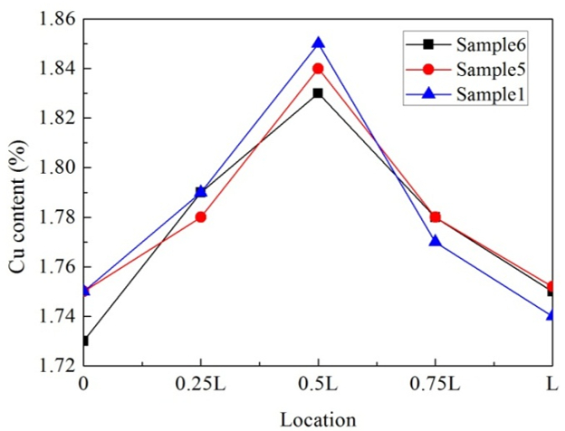 圖6 不同壁厚試樣顯微組織 2.2.2 壁厚對Cu含量的影響 圖7為不同壁厚試樣表面到心部位置銅的含量。可以看出,從試樣表面到心部,銅含量呈增加趨勢,由表面的1.73%~1.75變?yōu)樾牟康?.83%~1.85%,試樣1、試樣5和試樣6的心部銅含量分別為1.85%、1.84%和1.83%。由式(9)可知,金屬液中溶質(zhì)含量高,在擠壓力的作用下,這些富Cu的金屬液被強(qiáng)行擠到試樣心部,導(dǎo)致心部Cu含量比兩側(cè)高。