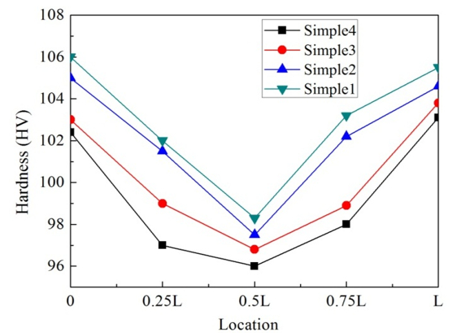 顯然金屬流動速度和動力粘度系數(shù)、液相體積分?jǐn)?shù)和壓力梯度有關(guān),在擠壓鑄造過程中擠壓力P遠(yuǎn)大于凝固收縮造成的負(fù)壓,由式(11)可以看出,外加壓力愈大, 則枝晶間液體流動速度加快,鑄件心部Cu的含量增大。 2.1.3 不同部位的硬度值 圖5為不同部位試樣由表面到心部硬度的變化曲線。可以看出,從試樣表面到心部,硬度值呈減小的趨勢。硬度(HV)由表面的102.5~106變?yōu)樾牟康?6~99。由于鑄件表面與模具壁接觸,冷卻速度增大,結(jié)晶完成所需要的時(shí)間短,溶質(zhì)再分配起到的作用很小,提高了合金的硬度,而心部形成的樹枝晶較為粗大,所以心部位置硬度相對較低。