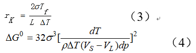 式中,Lm為熔化潛熱; 由式(3)和式(4)可知,提高過冷度可以減小臨界晶核半徑和臨界形核功,從而引起結(jié)晶核心數(shù)量的增加,結(jié)晶核心數(shù)目越多,則晶粒越細(xì)小。