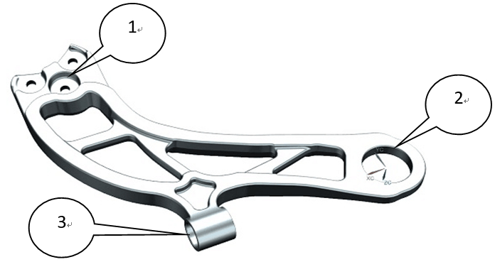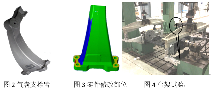 表2:鋁合金轉向節(jié)材料力學性能檢測結果 對擠壓鑄造鋁合金轉向節(jié)樣件加工并與對偶件裝配后進行臺架試驗,測試儀器為SCHENCK生產的160 KN/100mm液壓伺服試驗設備,試驗加載力的大小、方向、加載頻率等試驗參數均與原鑄鐵轉向節(jié)相同。對轉向節(jié)進行典型工況的靜強度及疲勞耐久試驗,樣件均未出現裂紋、變形等不符合狀況,通過了臺架試驗。 2、在汽車氣囊支撐臂中的應用 氣囊支撐臂是汽車輪邊驅動橋的核心支撐零件,見圖2,它與汽車箱體、減震器氣囊模塊、驅動系統(tǒng)相連,具有承載汽車后部載荷,支撐驅動橋并為減震氣囊起緩沖作用,在汽車行駛狀態(tài)下,承受著多變的沖擊減震載荷。其主要失效方式為疲勞破壞。 汽車氣囊支撐臂原來主要由球墨鑄鐵鑄造而成,為了實現汽車輕量化,國外開始研發(fā)高性能鋁合金氣囊支撐臂,由鑄鐵件、鑄鋼件向鋁合金鍛造件的升級換代,以實現氣囊支撐臂產品的輕量化。該鋁合金氣囊支撐臂用于某新能源汽車中巴,力學性能要求:本體取樣抗拉強度〉300 MPa,屈服強度〉210 MPa,斷后伸長率>8%。 該產品在開發(fā)初期產品臺架試驗曾發(fā)生斷裂,后經對產品結構的改進,見圖3, ?處的產品邊界往箭頭所指方向左移5 mm, ?處取消過渡圓弧成直線,螺栓安裝孔面抬高5 mm。改進后的零件整體剛度得到加強,受力情況更加合理,從產品本體取樣力學性能測試結果見表3,后經多輪臺架試驗產品性能完全滿足了設計要求,產品臺架試驗見圖4。
