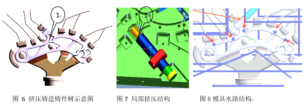 圖5:鋁合金控制臂 圖5為鋁合金控制臂零件,最大外形尺寸為320 mm×154 mm,平均壁厚為12 mm,結構根據拓撲優(yōu)化,提取骨架,結合裝配要求最終設計成帶弧形型彎曲外形的桿系結構。其在三個位置上存在裝配受力關系,對優(yōu)化后的結構進行受力分析,見表4,應力和變形滿足設計要求。鋁合金鑄件整體質量為2.5 kg,從該鑄件結構特點上看,鑄件結構簡單、壁厚適中,適合于采用擠壓鑄造成形。圖6為擠壓鑄造鑄件樹示意圖,圖7為局部擠壓結構圖,圖8為動模水路結構,圖9是擠壓鑄造控制臂X光探傷圖,從X光照片可以看出:擠壓鑄造控制臂在大孔處局部有微觀縮松外,其他部位未發(fā)現有縮孔、縮松缺陷。