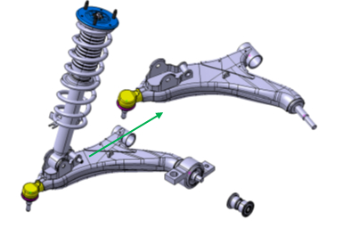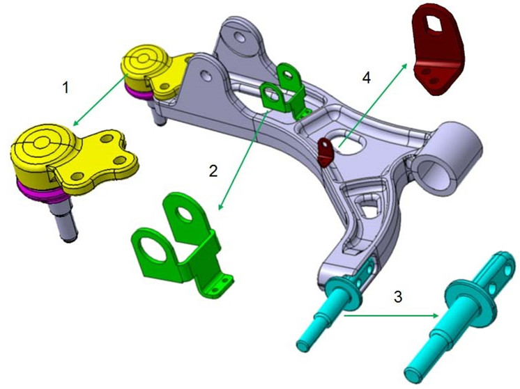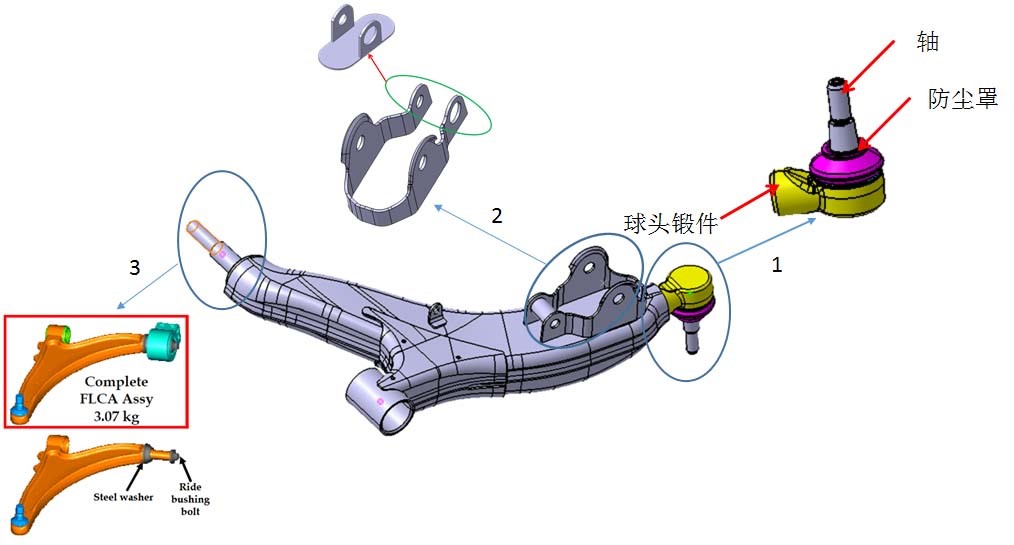 圖2:鋁合金控制臂的概念設(shè)計(jì)方案 圖 2中1處,將控制臂改為鋁合金鑄件后,球頭組件與控制臂的連接方式將由原有的焊接方式改為螺栓連接。為滿足更改后的連接方式,球頭鍛件的結(jié)構(gòu)必須重新進(jìn)行設(shè)計(jì),并通過機(jī)械加工完成樣件制作。只允許更改連接部分與球頭相關(guān)的部件包括軸,防塵、球碗、卡環(huán)、球頭銷,夾子和球套結(jié)構(gòu)則不允許更改。 為保證鑄件的結(jié)構(gòu)完整性,鑄造工藝性能以及鑄件的整體性能,確認(rèn)將原有沖焊的減震器支座分為兩體設(shè)計(jì)。減震器主支座改為鋁合金設(shè)計(jì),并與控制臂主體完成集成設(shè)計(jì)。減震器副支座仍然為沖焊結(jié)構(gòu),在通過對(duì)原有部件切割的基礎(chǔ)上增加底座,通過焊接的方式形成組件,組件通過螺栓連接的方式與鋁合金控制臂連接,組件的結(jié)構(gòu)示意見圖 2中2處。在鋁合金控制臂上要設(shè)計(jì)副支座的安裝限位,保證安裝到位。 圖 2中3處在原有設(shè)計(jì)中所有部件均為鋼制部件,更改為鋁合金后,軸部位材料為鋁合金,與之配合的是鋼制部件,在通常情況下鋁合金部件不能夠與其發(fā)生直接的摩擦配合。考慮有兩種解決方案,其一通常是采用增加鋼制墊片的方式解決鋁制部件與鋼制部件的配合問題,在增加鋼制墊片后,原有設(shè)計(jì)中軸的尺寸將發(fā)生改變,需要重新設(shè)計(jì);其二是借用原有的鋼制部件,重新設(shè)計(jì)連接部分結(jié)構(gòu),通過螺栓連接實(shí)現(xiàn)部件的裝配。 2.2 產(chǎn)品的設(shè)計(jì)方案 圖 3鋁合金控制臂的設(shè)計(jì)方案。基于原有沖焊部件設(shè)計(jì),無法對(duì)原有周邊的裝配環(huán)境進(jìn)行更改,必須仔細(xì)考慮原有部件的結(jié)構(gòu)與裝配。總體設(shè)計(jì)方案是采用集成設(shè)計(jì)“H”型的鋁合金擠壓控制臂取代原有的上板,下板,連接上板,連接下板,襯套套管和減震器支架形成一個(gè)整體控制臂。