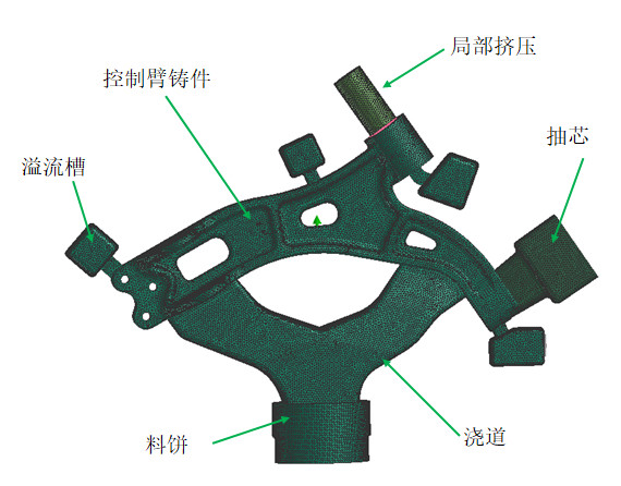 表1:原有結(jié)構(gòu)與全新設(shè)計(jì)結(jié)構(gòu)部件質(zhì)量對(duì)比 3、工藝開發(fā)與試制 鋁合金控制臂鑄造工藝的基本設(shè)計(jì)見圖 5。采用立式擠壓機(jī)進(jìn)行擠壓鑄造生產(chǎn),澆注系統(tǒng)由料餅和“Y”字型的澆道組成,在鑄件上方設(shè)置溢流槽。通過左側(cè)的抽芯形成鑄件上與原有結(jié)構(gòu)軸的安裝孔。通過設(shè)置抽芯形成在鑄件上部的連接孔,可以通過設(shè)置油缸的動(dòng)作,在開模前插入,或是在充填過程中插入,當(dāng)作擠壓針,消除鑄造缺陷。控制臂鑄件質(zhì)量為2.282 kg,控制臂料餅及澆注系統(tǒng)質(zhì)量為4.250 kg,溢流槽及排氣通道質(zhì)量為0.660 kg,總質(zhì)量為7.192kg,工藝出品率為31.7%,工藝出品率偏低。考慮到為試制開發(fā)部件,未對(duì)工藝出品率進(jìn)行優(yōu)化,在實(shí)際生產(chǎn)時(shí)可以考慮采用一模兩件的方式提高工藝出品率。