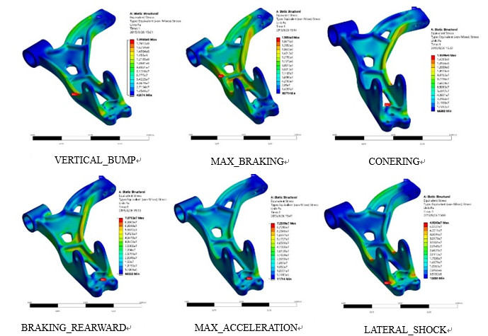 圖3:鋁合金控制臂設(shè)計(jì)方案 圖 3中1處,球頭組件采用原有結(jié)構(gòu),但取消原有焊接連接方式,在球頭鍛件上增加連接平面設(shè)計(jì),通過螺栓連接的方式與控制臂主體連接,在控制臂主體上也相應(yīng)的設(shè)計(jì)出連接平面和連接螺栓孔。2處將沖焊結(jié)構(gòu)中控制臂主體中的減震器之間分為兩個(gè)部分,主體部分與控制臂為鑄件,其余部分設(shè)計(jì)為一個(gè)鋼板部件,通過螺釘與控制臂主體連接。3處在概念設(shè)計(jì)中試圖將該部分集成至鋁合金鑄件中,但是在CAE分析中發(fā)現(xiàn),該部分的載荷較大,加之無法對(duì)結(jié)構(gòu)進(jìn)行更改,因而決定保留此部分的鋼制部件,在鋼制部件和控制臂主體上設(shè)計(jì)出連接結(jié)構(gòu),然后通過螺栓與控制臂主體連接。4處在原有設(shè)計(jì)中的高度傳感器支架無法集成入鋁合金鑄件中,所以需維持鋼板部件設(shè)計(jì),通過螺釘與控制臂主體連接。 2.3 產(chǎn)品的結(jié)構(gòu)分析 為保證結(jié)構(gòu)分析結(jié)果的正確性,獲取了原有鋼板沖焊的控制臂的相關(guān)材料信息。原有控制臂由15個(gè)不同材料的鋼板部件通過焊接構(gòu)成。通過相關(guān)鋼板標(biāo)準(zhǔn)的查詢,獲取了用于沖焊控制臂制造的不同鋼板材料的屈服強(qiáng)度、斷裂強(qiáng)度、斷后伸長(zhǎng)率和楊氏模量,用于CAE對(duì)比分析。控制臂共有VERTICAL_BUMP,CORNERING,BRAKIING_REARWARD,MAX_BRAKING,MAX_ACCELERATION,LATERAL_SHOCK,CURB_PUSH 7種工況條件。考慮到擠壓鑄造鋁合金AlSi7Mg-T6的斷裂強(qiáng)度為220 MPa。在分析過程中,要求任何區(qū)域內(nèi)的應(yīng)力分布不能夠大于200 MPa。對(duì)于局部應(yīng)力集中區(qū)域,可參考原有鋼板沖焊設(shè)計(jì)中的對(duì)比應(yīng)力,確保全新結(jié)構(gòu)設(shè)計(jì)結(jié)構(gòu)與原有結(jié)構(gòu)進(jìn)行CAE對(duì)比分析時(shí),相同部位鋁合金部件的應(yīng)力不得超過鋼制部件的1/3。 圖 4為6種工況條件的應(yīng)力分析結(jié)果,發(fā)現(xiàn)其應(yīng)力水平能能夠滿足部件的使用需求。圖 4中VERTICAL_BUMP,MAX_BRAKING和CONERING工況為非破壞工況,其最大應(yīng)力都未超過200 MPa,經(jīng)過對(duì)高應(yīng)力部位的分析,主要為應(yīng)力集中,且位于螺栓孔和減振器支座根部,同時(shí)對(duì)比了原有鋼制部件同樣位置的應(yīng)力,其數(shù)值未超過鋼制部件同樣位置應(yīng)力的1/3,故而判定合格。為安全考慮,加大了減振器支座根部的圓角,以便于降低應(yīng)力集中。 裝配檢查表明,全新設(shè)計(jì)結(jié)構(gòu)沒有超出原有結(jié)構(gòu)包絡(luò)面內(nèi),能夠滿足安裝條件。部件在局部結(jié)構(gòu)更改過程中,沒有涉及與其他部件有裝配關(guān)系的部分,結(jié)構(gòu)調(diào)整后,部件的裝配關(guān)系不變,可實(shí)現(xiàn)直接替換裝配。據(jù)此,確定設(shè)計(jì)數(shù)據(jù)。