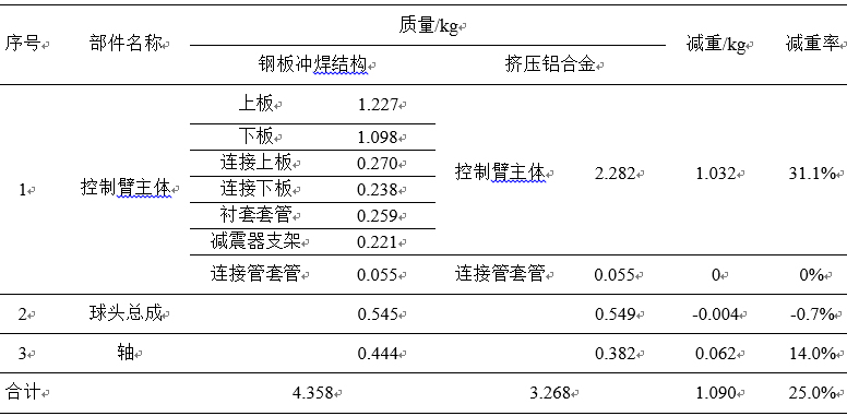 圖4:6種工況條件下的CAE應(yīng)力分析結(jié)果 2.4 產(chǎn)品設(shè)計(jì)總結(jié) 表 1為原有結(jié)構(gòu)與全新設(shè)計(jì)結(jié)構(gòu)部件質(zhì)量對(duì)比。通過采用集成控制臂鑄件取代了原有的上板,下板及連接上板等6個(gè)部件,并借用原有的連接套管。由表 1中的被替代的鋼制部件和集成鋁合金控制臂質(zhì)量數(shù)據(jù)可見,采用鋁合金集成鑄件后,質(zhì)量下降31%。球頭總成和軸借用了原有結(jié)構(gòu),但重新設(shè)計(jì)了連接部分的結(jié)構(gòu),并采用了螺栓連接方案。 原有設(shè)計(jì)結(jié)構(gòu)的總質(zhì)量為4.358 kg,全新設(shè)計(jì)結(jié)構(gòu)質(zhì)量為3.268 kg。可見通過應(yīng)用鋁合金金集成鑄件并借用部分原有結(jié)構(gòu)設(shè)計(jì)形成的鋼鋁混合結(jié)構(gòu)可以實(shí)現(xiàn)部件總成減重25%的效果,實(shí)現(xiàn)了預(yù)定的減重目標(biāo)。