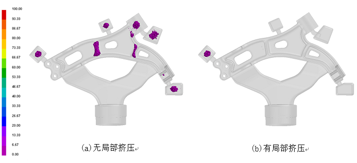 圖5:鋁合金控制臂鑄造工藝示意 采用ESI-ProCAST對(duì)鑄造過程進(jìn)行模擬分析,圖 6為不應(yīng)用局部擠壓和應(yīng)用局部擠壓兩種方式鑄件缺陷的模擬結(jié)果。可以看出,在未應(yīng)用局部擠壓的情況下,將局部擠壓針插入作為型芯使用;在應(yīng)用局部擠壓的情況下,局部擠壓針先不插入模具內(nèi),待完成充填后,插入模具內(nèi),對(duì)尚未完成凝固的鑄件進(jìn)行局部擠壓,消除鑄件內(nèi)部缺陷。由圖 6a可知,在不應(yīng)用局部擠壓的情況下,遠(yuǎn)離澆口部位以及加強(qiáng)筋部位還存在一定數(shù)量的缺陷。由于鑄件凝固順序的原因,無法通過增加保壓時(shí)間和增壓壓力的方式消除此類缺陷。通過應(yīng)用局部擠壓技術(shù),可以有效地消除通過增加保壓時(shí)間和增壓壓力無法消除的缺陷,見圖 6b。