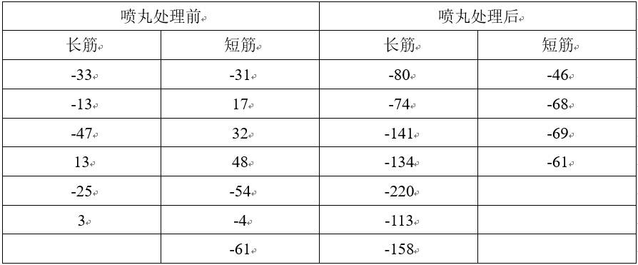 表1:鑄件加強筋表面殘余應力 2.2 環境模擬加熱溫度對A356鑄造鋁合金噴丸層殘余應力的影響 兩種鑄件的應力測定情況匯總于見表2。由此可見,由于在進行加熱之前對試樣表面進行了噴丸處理,長、短筋表層普遍存在壓應力狀態,而經過加熱之后噴丸處理所帶來的壓應力狀態明顯消退,這是由于溫度升高使試樣表層應力狀態恢復為原始的拉應力狀態或拉壓應力交替存在狀態,拉應力的存在會降低表層試樣的強度和塑性,故這將不利于試樣的疲勞性能。為此噴丸后鑄件推薦在室溫或長時間受熱溫度不高(建議低于100 ℃)的環境下使用較為合適,這樣有利于保持鑄件局部的噴丸強化效果。