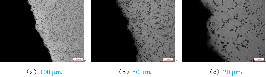 圖7:不同噴丸時間試樣金相組織(高倍) 3、結 論 (1)通過局部噴丸處理可以改善A356鑄造鋁合金鑄件表面的組織和力學性能。 (2)A356鑄造鋁合金經過表面噴丸處理之后,會在表層形成殘余壓應力,形成具有一定厚度的塑性變形層,該變形層的形成能夠提高表層的硬度和塑性,改善疲勞性能;另外通過局部噴丸還可以明顯地細化表層組織中的共晶Si晶粒,使其形貌由粗塊狀轉變為細小蠕蟲狀或顆粒狀組織,使合金表層組織更加均勻細小。 (3)通過噴丸處理在表層形成的壓應力層在經過加熱之后原來的殘余壓應力會消失,恢復至拉壓應力交替存在的狀態。因此噴丸后鑄件推薦在受熱溫度較低的環境下使用較為合適(建議零件長時間使用溫度小于100 ℃),這樣有利于保持鑄件局部的噴丸強化效果。 (4)通過噴丸處理形成的塑性變形層具有一定厚度,且從表層至心部強化效果逐漸弱化。隨著噴丸時間的增加,合金表層硬度呈現逐漸上升的趨勢,但到后期繼續延長噴丸時間,硬度增加趨勢不明顯,反而會對材料表面產生損傷,增大表層應力集中傾向。