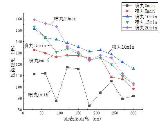 圖4:噴丸處理后合金表層的金相組織 2.4 噴丸時間的影響 不同噴丸時間下試樣表層至心部顯微硬度見圖5。可以看出,隨著測試位置距噴丸表層距離的增加,試樣硬度總體呈下降趨勢,且隨著噴丸時間的延長,使材料表層發生更加嚴重的塑性變形,使得材料噴丸層的硬度逐漸上升。但有研究指出,并不是噴丸時間越長越好,由于噴丸處理會導致材料表面粗糙度提高,因此在噴丸工藝參數相同的條件下,噴丸試件過長會導致表層塑性變形嚴重,使材料表面產生裂紋,影響材料的服役性能與疲勞壽命。由試驗數據可知在0~30 min內隨噴丸時間的增加材料表層硬度逐漸增加,在噴丸時間為30 min時可使表層硬度提高1.35倍,但考慮到工業生產需要及能源消耗問題,將噴丸時間繼續延長硬度增幅不明顯,這樣反而增加了能源與時間的損耗,降低生產效率,因此該零件在實際生產中建議噴丸時間取30 min左右。