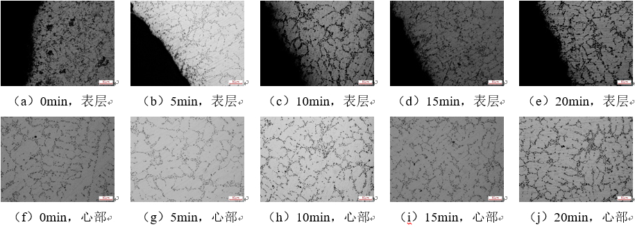 圖5:不同試樣表層至心部顯微硬度變化情況 圖6和圖7分別為不同噴丸時間試樣的表層及心部的金相組織。可以看出,經過噴丸處理后表層組織的共晶Si明顯減小,并隨著噴丸時間的增加,細化效果更加明顯,表層組織變得更加均勻,共晶Si晶粒變得更加細小均勻。噴丸處理能有效的細化組織,使共晶Si相分布均勻。由于噴丸時高速粒子對表層的撞擊作用會碎化粗大的共晶Si相,細化組織。 對單一試樣由于噴丸處理使組織表層發生塑性變形,共晶Si分布更加均勻,且隨著噴丸時間的延長金相表層組織的均勻性增加;對于噴丸時間不同的試樣,隨著噴丸時間的延長,表層的晶粒變得愈加細小,具有比心部更小且均勻的組織。
