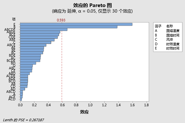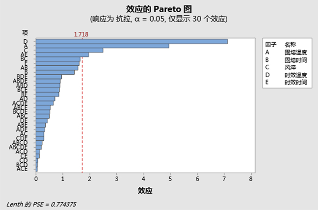 表4:全因子試驗設計方案和力學性能 2.2 試驗分析 使用Minitab分別對抗拉強度、屈服強度和伸長率進行所有項的因子分析,得出對各力學性能的Pareto圖見圖3~圖5,但因子分析結果均沒有出現P值,需要按Pareto圖進行模型精簡,騰出自由度并計算出殘差誤差,從而計算出P值。對抗拉強度只保留了D、A、C、E以及AE交互;對屈服強度只保留了D、A、C、E、AB、B;對伸長率只保留了E、B;另外從圖3和圖4可知時效溫度D對抗拉強度和屈服強度影響最大,其次是固溶溫度A,從圖5可知時效時間E和固熔時間B對伸長率影響最大。
