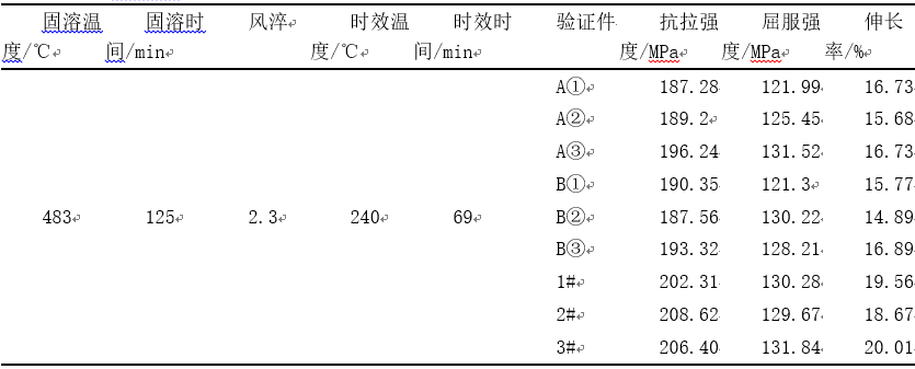 圖6:多響應預測圖 由圖6可知,雖然精簡模型后減少了很多不顯著的交互作用因子,提高了整體的復合合意性,但同樣會把可預測的熱處理參數范圍大大壓縮,一般定義復合合意性大于0.85以上認為預測是有效的,所以該實驗優化結果存在預測范圍不大的不足之處。預測圖只可以用于最優參數組合,即固溶溫度為483 ℃、固溶時間為125 min,風淬風量調至最大,時效溫度為240 ℃、時效時間為69 min。在下一輪試驗中,可以適當增大各因子的水平差異,加大試驗設計因子分析范圍。 2.4 試驗驗證 最后,使用2件(A,B)橫梁結構件產品和3條A型試棒(1#,2#,3#)用最優的熱處理參數進行生產驗證,按圖1位置(編號①、②、③)對產品進行取本體切片和拉伸,萬能拉伸試驗機測出的力學性能結果見表7。