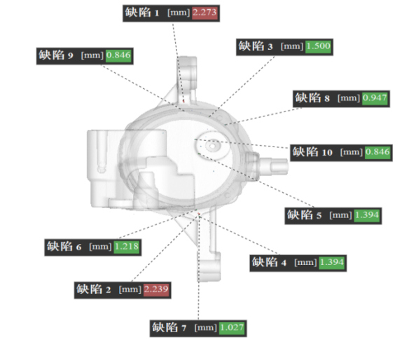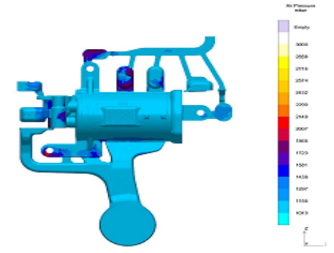 圖7:蓄能器殼體CT報告 3、結(jié)語 局部壁厚大于10 mm的壓鑄件在成形過程必然產(chǎn)生縮孔,通過局部擠壓工藝技術(shù)可以將縮孔控制在0.8mm一下,提高了鑄件的合格率和內(nèi)部質(zhì)量。擠壓銷設(shè)計必須要符合高強度要求并且冷卻充分,在大于5倍增壓壓力的工況下,擠壓銷不會變形彎曲。該技術(shù)可以實現(xiàn)更加復雜的集成化設(shè)計汽車機構(gòu)件一次壓鑄成形,對于解決一個鑄件多處壁厚大于10mm以上壓鑄模具和工藝開發(fā)有極高的參考和應用價值。