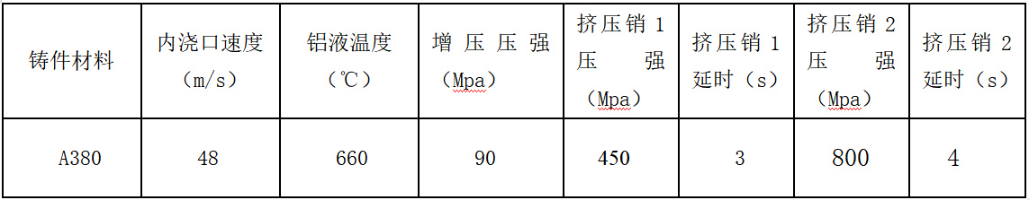 圖6:擠壓機構(gòu)設(shè)計 2、擠壓壓鑄工藝設(shè)計 1.1 壓鑄工藝參數(shù)設(shè)計 設(shè)計進料速度、鋁液溫度、模具溫度等,由于蓄能器殼體的壁厚差較大,筒體部位壁厚為3 mm,在對進料溫度,進料速度,增壓壓強等參數(shù)進行多次試驗,最終選擇660 ℃較為合適,內(nèi)澆口進料速度選擇48 m/s,增壓壓強為90 MPa。