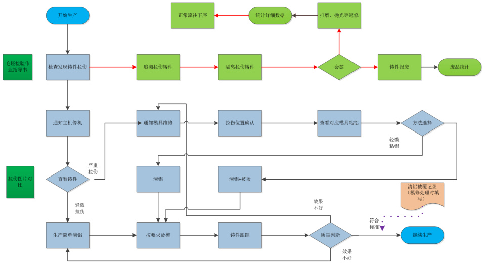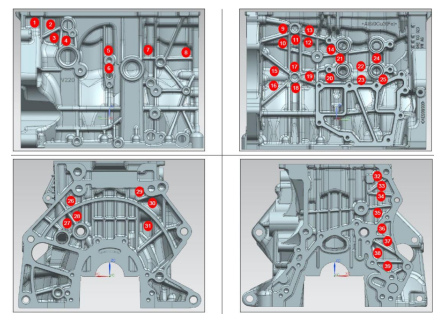 圖7:熱成像儀對模具溫度進(jìn)行分析控制 影響模具溫度的參數(shù)很多,除了直接監(jiān)控模具溫度外,定期監(jiān)控冷卻水流量,脫模劑噴嘴是否堵塞,以及鑲塊是否按要求定期清理和更換等均非常重要。 2.5 產(chǎn)品檢驗 在實際生產(chǎn)過程中由于各種各樣的原因也可能導(dǎo)致零件泄漏,因此對零件進(jìn)行定期檢測十分必要。針對壓鑄內(nèi)部縮孔可進(jìn)行定期的X光和CT進(jìn)行掃描;針對零件表面拉傷,鑄造工人可通過目視進(jìn)行檢測,一旦發(fā)現(xiàn)表面拉傷、粘模,需要停機(jī)確認(rèn)產(chǎn)生原因,避免批量質(zhì)量問題產(chǎn)生,同時有必要對零件進(jìn)行追溯,圖8是針對發(fā)現(xiàn)零件表面拉傷后的控制方案;另外針對有局部擠壓工藝的,需要定期測量零件的擠壓深度,以監(jiān)控局部擠壓的有效性。常見的缺陷是局部擠壓深度不足,這種情況下很多時候是由于擠壓銷卡滯導(dǎo)致。當(dāng)出現(xiàn)產(chǎn)品泄漏后,以及試漏不良率較高時可對產(chǎn)品進(jìn)行浸滲,試漏不合格且泄漏值在一定范圍內(nèi)的零件進(jìn)行100%浸滲,二次試漏合格率在95%以上。但浸滲成本相對較高。圖9是總結(jié)的關(guān)鍵控制點。運用該方案我們連同壓鑄件生產(chǎn)廠家對發(fā)動機(jī)涉及機(jī)油通道和冷卻液通道(見圖10)的所有壓鑄鋁件進(jìn)行了梳理,取得了非常好的成果。