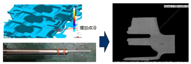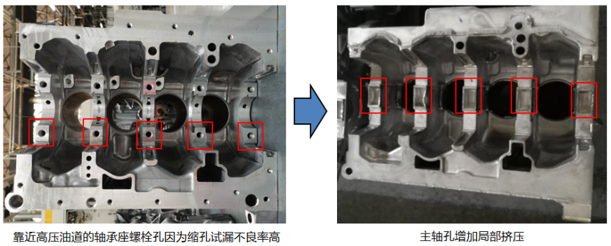 圖5:增加高壓點冷,縮孔得到明顯改善 某缸體加工后進(jìn)行100%的產(chǎn)品泄漏測試,發(fā)現(xiàn)產(chǎn)品試漏不良率較高,經(jīng)過對不良品統(tǒng)計分析,發(fā)現(xiàn)95%為高壓油道測試不合格。CT掃描發(fā)現(xiàn),靠近高壓油道的主軸承座螺紋孔底部存在較多縮松,增加預(yù)鑄孔后試漏不良率并未得到明顯改善。隨后在主軸孔增加局部擠壓工藝(見圖6),使該位置更加致密,從而減少縮孔、縮松,經(jīng)過驗證,試漏不良率從4%下降至0.2%,效果明顯。