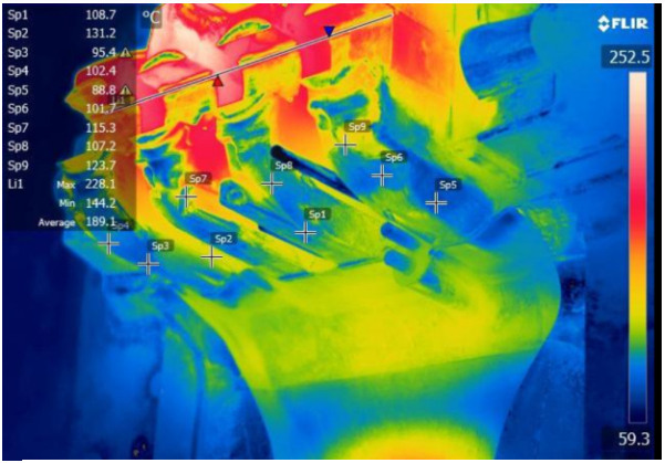圖6 使用局部擠壓,該位置試漏不良率得到明顯改善 好的工藝方案同樣對降低縮孔比例以及降低鑄件表面粘模、拉傷有著很大的作用。有時通過單純的增加預(yù)鑄孔不一定能解決內(nèi)部縮孔的問題,這時候需要運用點冷,即在模具或者型芯內(nèi)部增加冷卻循環(huán)通道。點冷分為普通點冷和高壓點冷,兩者的選用仍需通過模具溫度來確定,如果模具溫度較高,選擇高壓點冷可迅速將熱量帶走,這種工藝方案非常實用,也在很多壓鑄廠成功應(yīng)用。同時需要定期檢查和更換型芯,避免型芯變形、漏水等帶來其他質(zhì)量問題。 目前在壓鑄件的重點位置采用局部擠壓工藝的運用越來越廣泛,局部擠壓使內(nèi)部鑄造質(zhì)量更加致密,因此產(chǎn)生縮孔、縮松的比例更低。在局部擠壓過程中重點需要控制擠壓的起始時間、擠壓銷的噴涂(避免擠壓銷卡滯),同時對擠壓深度也應(yīng)進(jìn)行監(jiān)控。 除了上述方案外,模具表面處理、冷卻水類型、噴涂方式、噴涂時間、噴涂角度、噴涂距離和噴涂路徑等都需要進(jìn)行重點考慮。如冷卻水,對于一些要求較高的鑄件,很多壓鑄廠采用純凈水進(jìn)行冷卻,避免冷卻通道結(jié)垢,從而減小冷卻流量,導(dǎo)致模具溫度達(dá)不到要求。針對噴涂的工藝設(shè)置,現(xiàn)在仿形噴涂得到越來越多的運用,同時對噴嘴位置的定期校準(zhǔn)也很必要。總的來說,工藝參數(shù)的制定對壓鑄件質(zhì)量影響很大,需要通過大量的試驗和經(jīng)驗進(jìn)行驗證,同時也是一個持續(xù)優(yōu)化的過程。 2.4 過程控制 過程控制的主要目的是確保相關(guān)參數(shù)在已制定工藝方案的規(guī)定下得到穩(wěn)定的實施。模具溫度的監(jiān)控尤為重要,目前使用熱電偶可對模具溫度實時監(jiān)控,但由于不能覆蓋所有的位置,因此使用熱成像儀或者測溫槍對模具溫度進(jìn)行定期的測量十分必要。熱成像儀除了用于具體問題分析外,在模具溫度參數(shù)制定時進(jìn)行連續(xù)的溫度測量非常重要(見圖7)。