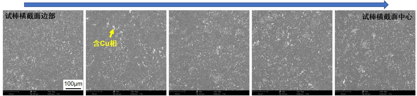圖1 擠壓鑄造拉伸試棒示意圖 試棒取拉伸段的橫截面進行微觀組織分析,使用NETZSCH DSC204進行鑄態試樣的DSC曲線分析,使用phenom XI掃描電鏡(SEM)進行微觀組織的觀察分析,使用DDL200拉伸試驗機進行拉伸性能測試;而后對鑄態試樣進行T6處理,490 ℃×4 h固溶處理后水淬,而后進行170 ℃×6 h的時效處理,觀察T6處理后的微觀組織以及拉伸性能測試;通過JEM-2100場發射透射電鏡(TEM)觀察時效后的納米強化相析出,最后進行拉伸斷口的掃描電鏡觀察。 2.試驗結果與討論 圖2為擠壓鑄造Al-Si-Cu-Mg合金試棒橫截面從試棒邊部到心部再到邊部的均勻性對比。可以看出,擠壓鑄造試棒橫截面的微觀組織較為均勻,其中的白色相為含Cu相,主要為θ-Al2Cu相與Q-AlCuMgSi相,在試棒橫截面分布較為均勻,未出現明顯的偏聚,這有利于合金力學性能的均勻穩定。