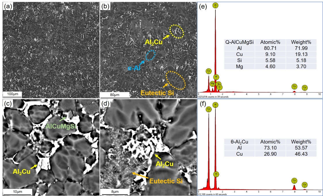 (a) 基體組織 (b)析出相形貌 (c) 含Cu相形貌 (d)共晶Si形貌 (e) Q-AlCuMgSi相EDS (f)θ-Al2Cu相EDS