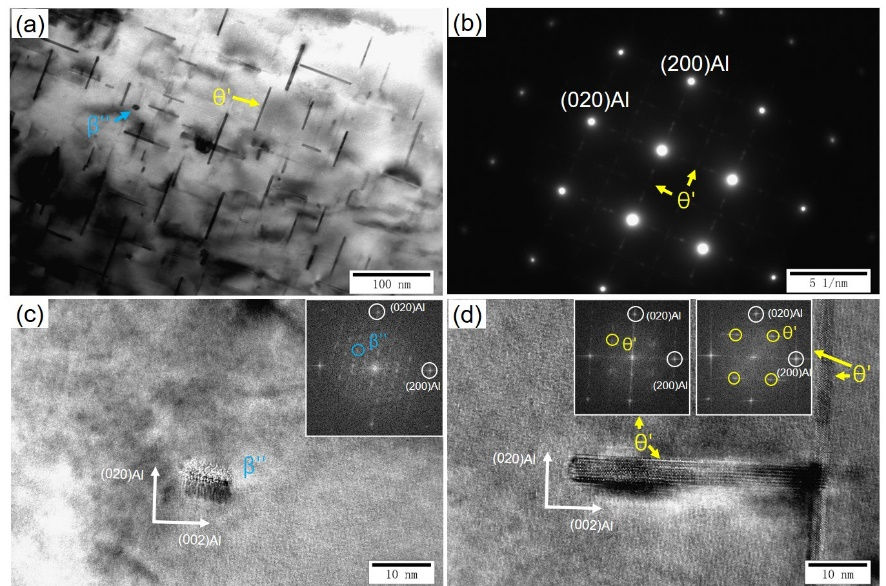 (a) TEM圖像; (b) 選區衍射斑點; (c) β''相的HRTEM圖像; (d) θ'相的HRTEM圖像