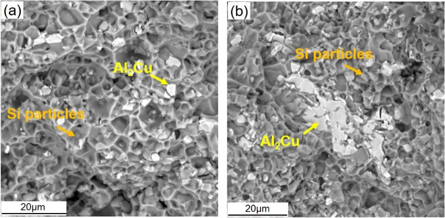 表2 鑄態與T6處理后合金的拉伸性能 圖7a和圖7b為3號和5號T6拉伸試樣的拉伸斷口組織。可以看出,斷口組織中出現了較為均勻的韌窩形態,球化的硬質Si顆粒在拉伸過程易出現應力集中形成斷裂源,均勻彌散的Si顆粒能夠一定程度分散拉伸過程的應力集中且形成均勻的韌窩組織,3號試樣這種較為均勻致密的斷口形態也能反映出合金相對較高的伸長率。而5號試樣的斷口組織則出現了尺寸較大的長片狀Al2Cu相,斷口組織的均勻性也較差,反應在伸長率上也說明了組織的不均勻性導致合金韌性的下降。