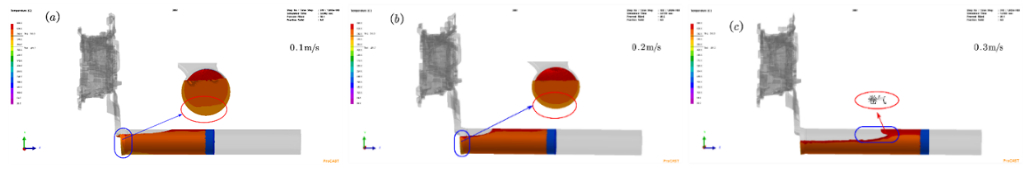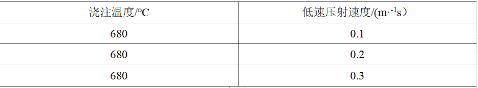 表2 低速壓射速度試驗(yàn)參數(shù) 選擇澆注溫度為680 ℃,低速壓射速度分別為0.1、0.2、0.3 m/s進(jìn)行速度試驗(yàn),模擬結(jié)果見(jiàn)圖5.。從圖5a和圖5b可以看出,低速壓射速度在0.1m/s和0.2m/s都有預(yù)結(jié)晶產(chǎn)生,其中在0.1m/s時(shí),速度過(guò)小,導(dǎo)致鋁液溫度降低過(guò)多,產(chǎn)生的預(yù)結(jié)晶量過(guò)多,降低鋁液的流動(dòng)性,進(jìn)一步降低鑄件質(zhì)量,而從圖6c可以看出,低速壓射速度在0.3 m/s時(shí),速度過(guò)高,熔融金屬在壓室內(nèi)出現(xiàn)了卷氣,易形成氣孔。低速壓射速度在0.2 m/s時(shí),鋁液整體流動(dòng)平穩(wěn)且產(chǎn)生預(yù)結(jié)晶量少,因此選擇低速壓射速度為0.2m/s。