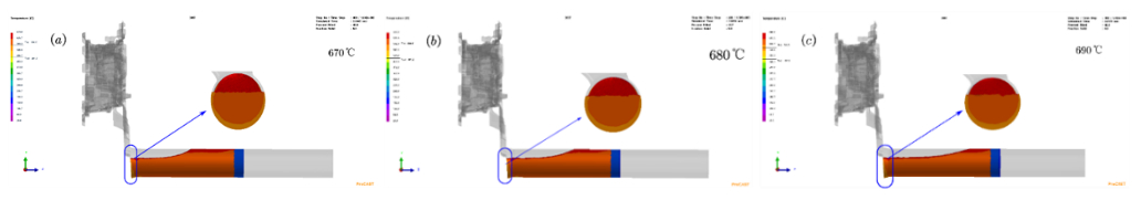圖5 ADC12的流動(dòng)狀態(tài)隨壓射速度的變化結(jié)果 另外,模擬了3種溫度下(670、680和690℃)的充型過(guò)程,見(jiàn)圖6,可以看出三種溫度下預(yù)結(jié)晶量無(wú)明顯差異。為了防止由于壓射溫度高而導(dǎo)致氣體溶解度增大,在壓鑄過(guò)程中難以析出,降低鑄件性能,且溫度過(guò)高,使合金氧化加劇,易產(chǎn)生縮孔、裂紋等。因此選擇澆注溫度為680 ℃。