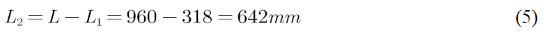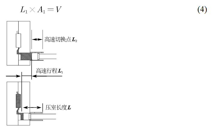 圖7 高速切換點(diǎn)位置示意圖 由前述分析A1=15 38 6m㎡,V=4.89259×106 mm³,代入(4)得L1=318mm。那么理論高速切換點(diǎn)L2由下式計(jì)算得出。