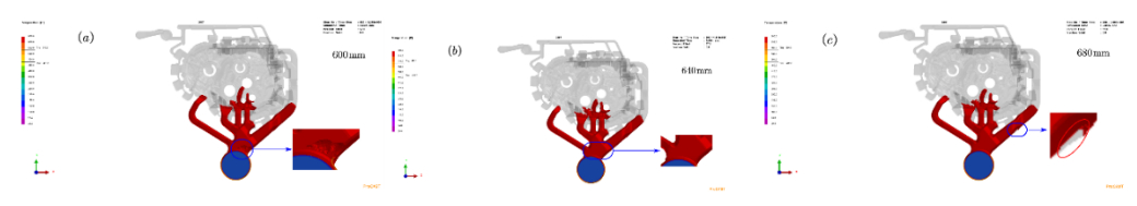 為了驗(yàn)證理論高速切換點(diǎn),設(shè)置了3個(gè)位置進(jìn)行試驗(yàn),由以上分析設(shè)置壓射溫度為680 ℃。低壓速度為0.2 m/s,設(shè)置沖頭高速切換點(diǎn)位置為600、640和680 mm,見(jiàn)圖8。可以看出,相同填充率(57%)下,600 mm高速切換點(diǎn)的分流錐腔內(nèi)鋁液沒(méi)有充滿,氣體不能及時(shí)排出,鑄件很大可能出現(xiàn)縮松縮孔,降低鑄件質(zhì)量(圖8a),在680 mm沖頭高速切換點(diǎn)的澆道內(nèi)也沒(méi)有充滿鋁液(圖8c),而在640 mm沖頭高速切換點(diǎn)鋁液充型平穩(wěn) (圖8b),金屬液有效地充滿了澆道,但是需要考慮實(shí)際生產(chǎn)中電氣設(shè)備工作時(shí)間的延遲,因此高速切換點(diǎn)選擇630 mm。