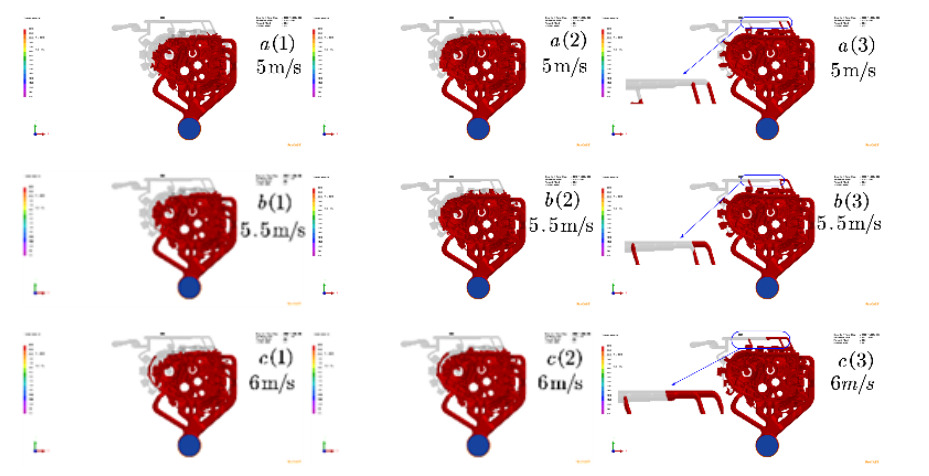 式中,v1為高壓速度,m/s;v為填充速度,m/s;A1為壓射沖頭(近似腔室)的橫截面積,m㎡;Ag為內(nèi)澆口的橫截面積,m㎡。由Ag= 2 038 m㎡,v=40 000 mm/s,A1=15 386 m㎡,計(jì)算可得v1= 5.298m/s。為驗(yàn)證計(jì)算的理論高壓速度是否合適,設(shè)置3組參數(shù)為5、5.5和6 m/s,模擬不同高壓速度下的高壓鑄造過(guò)程。觀察填充率為85%、90%和95%左右的情況,見(jiàn)圖9。 從圖9b(3)和9c(3)可以看出,在5.5 m/s和6 m/s的速度下,溢流通道被金屬液堵塞,會(huì)影響排氣效果。填充速度越大,金屬液充填越多,溢流通道堵塞越明顯。從圖9a(3)可以看出,溢流通道沒(méi)有發(fā)生堵塞,排氣效果較好,因此,選擇高速壓射速度為5 m/s較為合適。