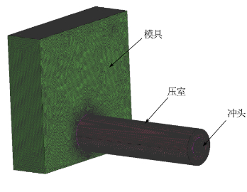 式中,A1為壓射沖頭(近似腔室)的橫截面積,m㎡。 2、仿真和參數(shù)化 采用ProCAST 軟件進(jìn)行模擬,壓室的界面?zhèn)鳠釤嵯禂?shù)為1 200 kW/(㎡K),模具界面?zhèn)鳠嵯禂?shù)為4 000 kW/(㎡K)。為了使模擬更接近生產(chǎn)的狀態(tài),采用帶壓室的模具進(jìn)行仿真,沖頭用來(lái)推動(dòng)熔化的金屬進(jìn)入型腔以模擬合金的流動(dòng)性。圖4為鑄件的參數(shù)化網(wǎng)格。