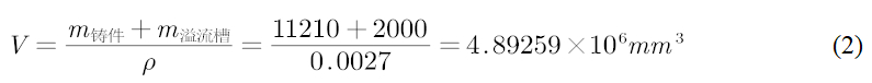 式中,Ag為內(nèi)澆口截面積,m㎡;V為壓鑄件與溢流槽體積,mm³;t為填充時(shí)間,s;v為內(nèi)澆口速度,mm/s。由于鑄件質(zhì)量為11.21 kg,為了不過(guò)多的浪費(fèi)材料,又可以有效的排出氣體和夾渣,溢流槽質(zhì)量設(shè)計(jì)為2 kg,合金密度=0.0027 g/mm³,那么由下式計(jì)算得出V。