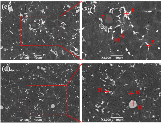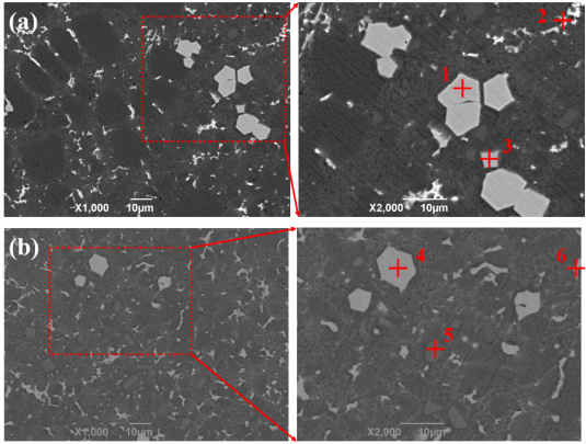 圖10 澆注系統(tǒng)B處的顯微組織對比:(a)常規(guī)壓鑄;(b)流變壓鑄 3、結(jié)論 (1)測定了ADC12鋁合金的固液區(qū)間為539~590 ℃,流變壓鑄ADC12鋁合金成分主要由Al、Si和Al2Cu相組成。 (2)流變壓鑄過程中,隨著與壓鑄機壓室距離的增加,合金組織由粗大枝晶向球形或近球形晶粒演變,組織形成機理包括了枝晶的破碎和熔體爆發(fā)形核。 (3)確定了不同形貌的金屬化合物的成分:白色多邊形的為α-Al15(Fe,Mn)3Si2,白色漢字狀的為Al2Cu,深灰色塊狀或條狀的為富Si相,少量白色粗針狀為β-Al5FeSi。 (4)流變壓鑄的鋁合金抗拉強度為248 MPa,優(yōu)于常規(guī)壓鑄的鋁合金的210.7 MPa。兩者的屈服強度比較接近,流變壓鑄的伸長率也略優(yōu)于常規(guī)壓鑄。