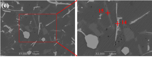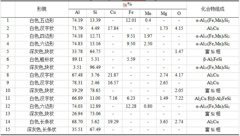 圖8 合金中金屬間化合物的SEM圖(圖a-e對應(yīng)位置A-E) 圖8為合金中金屬間化合物的SEM圖。由XRD及金相組織可以確定,流變壓鑄ADC12鋁合金主要由α-Al、Si、Al2Cu相組成。但從圖8可以看出,除此之外還存在一些不同形貌的未知金屬間化合物。圖8中各處的EDS點分析結(jié)果見表2。可以根據(jù)摩爾比來確定不同形貌的化合物:白色多邊形的為α-Al15(Fe,Mn)3Si2,白色漢字狀的為Al2Cu,深灰色塊狀或條狀的為富Si相,少量白色粗針狀為β-Al5FeSi。其中點11處Al2Cu混雜了部分β-Al5FeSi。 在圖8中,不同位置的Al2Cu數(shù)量最多,為強化相。一般認(rèn)為粗針狀β-Al5FeSi對基體起到割裂作用,會降低力學(xué)性能。而圖中絕大多數(shù)鐵相表現(xiàn)為白色多邊形的α-Al15(Fe,Mn)3Si2,改善了少量β-Al5FeSi帶來的破壞作用。