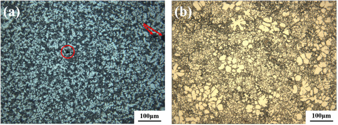 圖9 ADC12常規(guī)壓鑄與流變壓鑄的力學(xué)性能 圖10為常規(guī)壓鑄與流變壓鑄試樣在B處的顯微組織對比。可以看出,常規(guī)壓鑄狀態(tài)下表現(xiàn)為均勻細(xì)小枝晶及激冷態(tài)晶粒,其中存在較多的黑色微氣孔,而流變壓鑄的組織中存在大量的球形或近球形α-Al,且固相含量高。研究表明,半固態(tài)壓鑄件的力學(xué)性能隨著固相率提高而隨之提高,而常規(guī)壓鑄在充型過程中容易發(fā)生卷氣和夾雜,使得力學(xué)性能降低。究其原因,流變壓鑄使得試樣內(nèi)部氣孔等缺陷減少,組織致密均勻, 故其強度和塑性均優(yōu)于常規(guī)壓鑄。