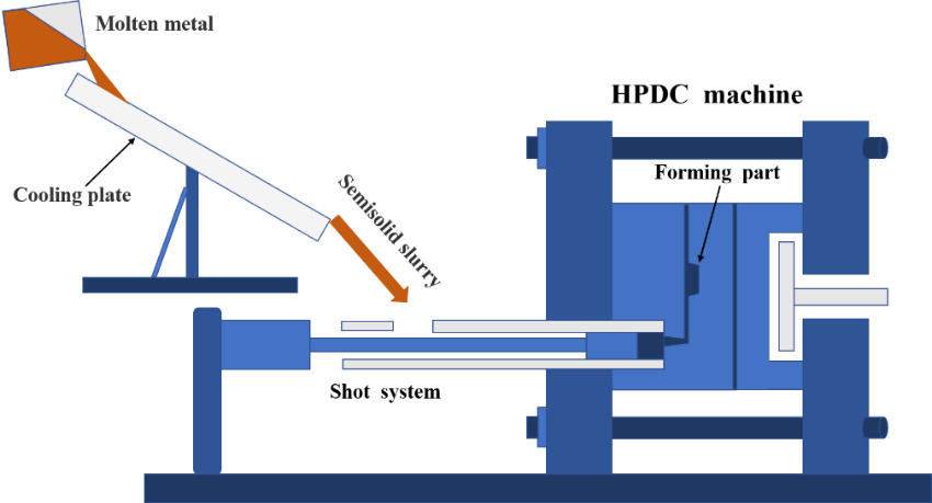 圖1 ADC12鋁合金重力鑄造組織 1.2 半固態(tài)漿料的制備及壓鑄過程 傾斜板流變壓鑄過程見圖2。試驗時,首先將ADC12鑄錠放于石墨坩堝中于620 ℃熔化;同時,在傾斜板表面涂上石墨涂料,其中傾斜板材質(zhì)為45號鋼,長度為100 cm,傾角為30°,調(diào)整支架確保金屬液從傾斜板尾端準(zhǔn)確流入壓鑄機澆口處;將壓鑄機型腔預(yù)熱至200 ℃。 對熔液進(jìn)行除氣扒渣后,將其從傾斜板上端倒入,經(jīng)過傾斜板的冷卻與自身重力作用,形成半固態(tài)漿料直接流入壓鑄機進(jìn)料口。用熱電偶測量漿料的溫度,待溫度下降至560~570 ℃時,進(jìn)行壓鑄成形,開模取出試樣。