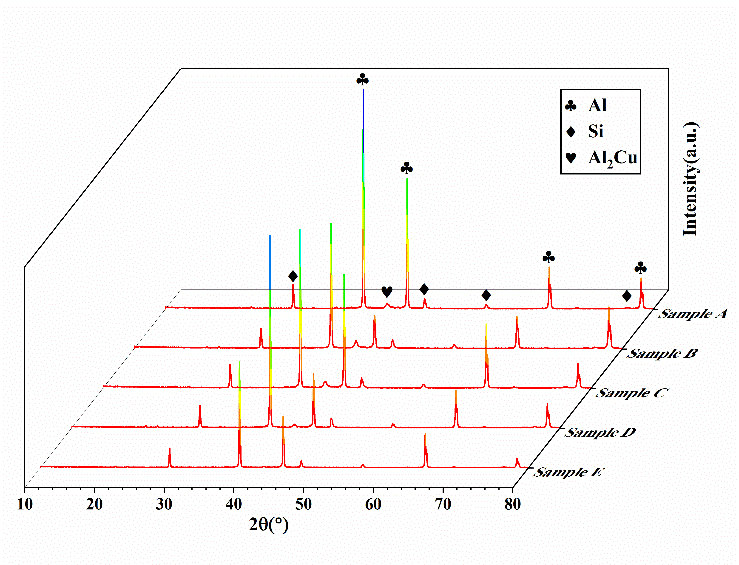 圖4 ADC12鋁合金的DTA曲線 鑄件不同取樣位置的XRD譜圖見圖5。譜圖表明,其主要由Al、Si和Al2Cu 3種相組成。對于ADC12鋁合金,最初結(jié)晶出α-Al 相與α-Al+Si 的共晶相,又由于合金中的Cu 含量較高,會產(chǎn)生 L→α-Al+Si+Al2Cu 共晶反應(yīng),故最終的組織主要由α-Al、Si、Al2Cu 三相組成。